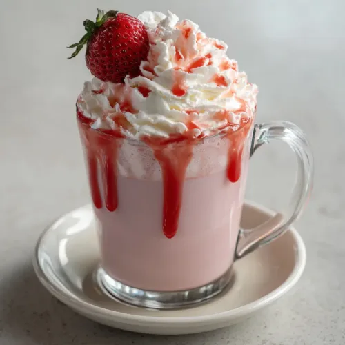 This decadent Strawberry Hot Chocolate is a visually stunning café-style treat. With its rich, pastel pink white chocolate base and glossy fruit syrup, it is absolute perfection in a glass mug.