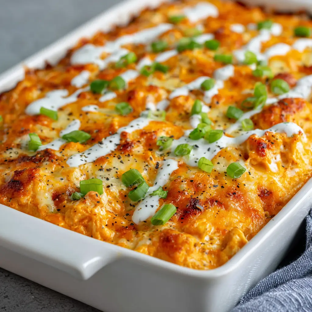 To finish it off, we take this Buffalo Chicken Cheese Bake to the next level with a vibrant white drizzle of ranch dressing in a perfect zigzag pattern. Garnished with freshly chopped green onions and a sprinkle of cracked black pepper, it looks just as stunning in its white ceramic rectangular casserole dish as it tastes.