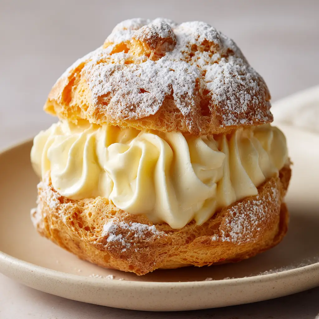 Master the art of Classic Cream Puffs with this step-by-step recipe. Featuring crisp, golden-brown choux pastry shells generously overstuffed with a thick, pale-yellow vanilla pastry cream and heavily dusted with fine white powdered sugar.