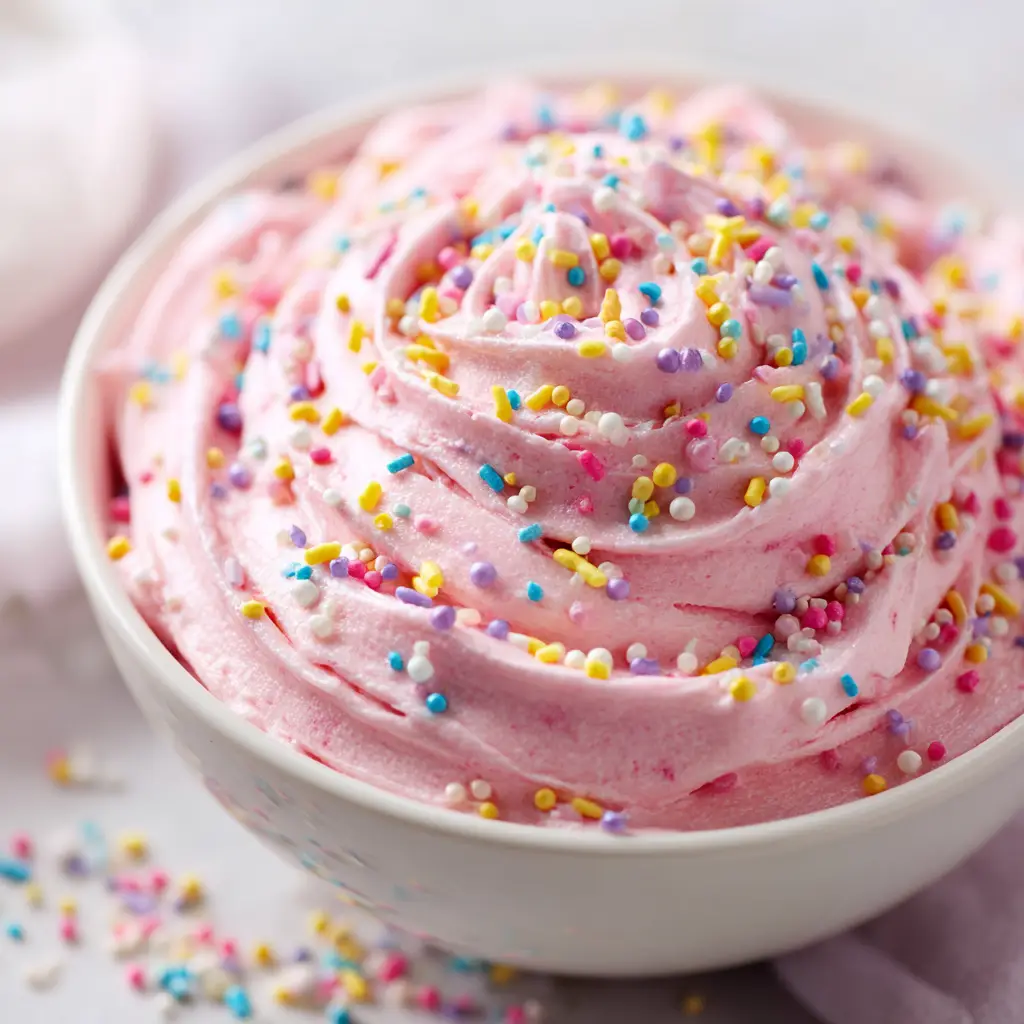 A close-up shot of the creamy funfetti dip, showing its light and fluffy texture, packed with colorful Easter sprinkles.