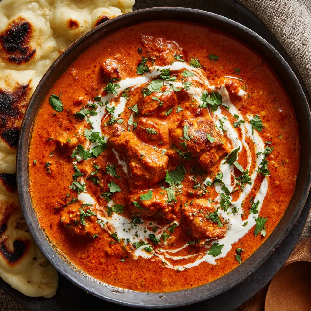 Master this incredibly rich and creamy Indian Chicken Curry featuring tender simmered chicken breast chunks in a vibrant orange-red spiced tomato and coconut sauce. Garnished with a coconut cream swirl, fresh cilantro, and served with blistered naan.