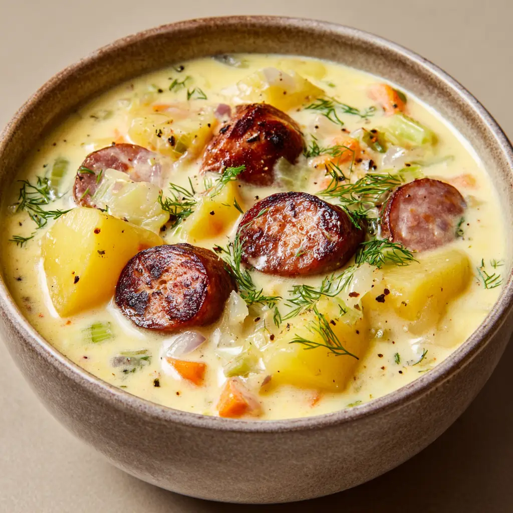 If there is one comfort food that perfectly balances rustic charm with culinary elegance, it is a steaming bowl of Kielbasa Potato Soup. This recipe delivers a luxurious, thick pale yellow cream broth that coats the back of a spoon beautifully. It is a masterclass in building layers of flavor, starting with deeply browned smoked sausage and finishing with vibrant, fresh herbs.