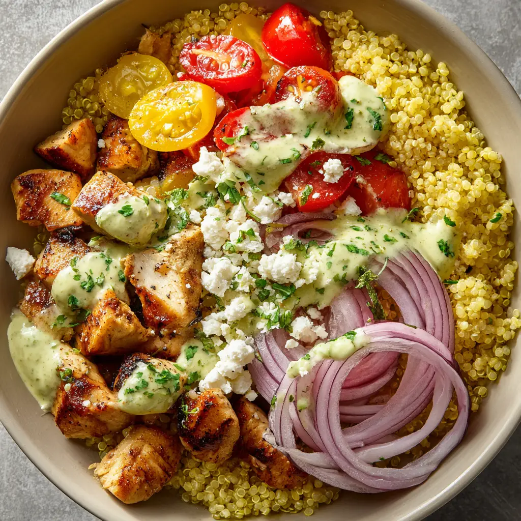 - Assemble the Bowls: Divide the cooked quinoa among four bowls. Top with the cooked chicken, cucumber, tomatoes, red onion, Kalamata olives, and crumbled feta cheese. Drizzle generously with the lemon vinaigrette before serving.