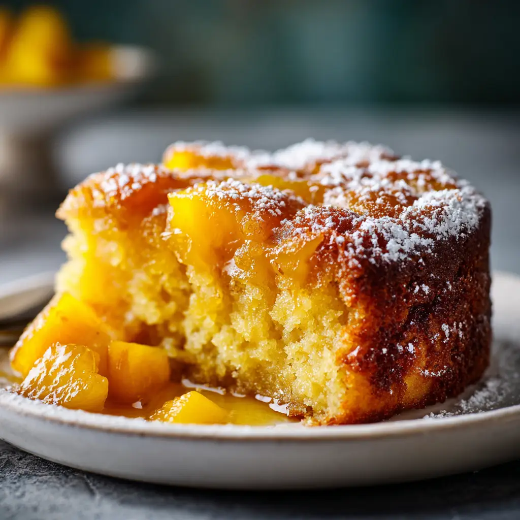 A delicious and moist peach cake recipe shown on a plate, ready to be served. This easy homemade cake is packed with fresh, juicy peaches.